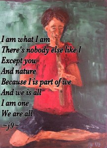 Imperfected Beauty Posted on April 27, 2015 by J9 Artist in poem, tableau, Work I am what I am There’s nobody else like I Except you And nature Because I is part of we And we is all I am one We are all Like Loading... Published by J9 Artist I am a self taught impressionist-realism- contemporary-something visual artist. Very passionate, staying true to myself, I seek the beauty in everything around us. View all posts by J9 Artist