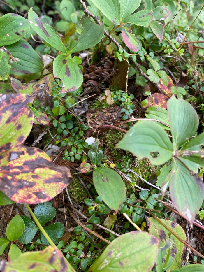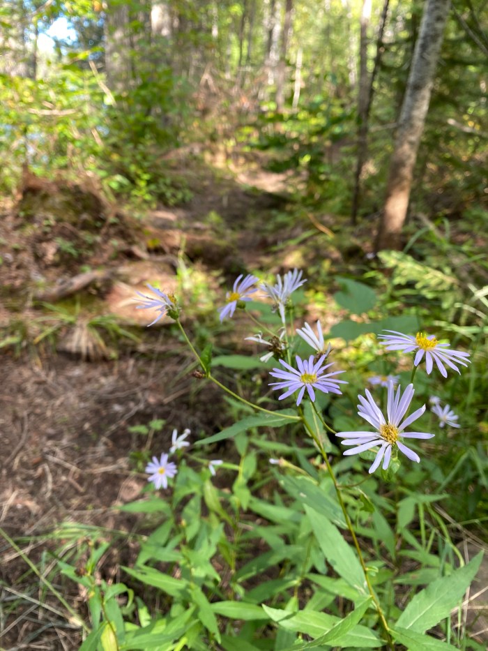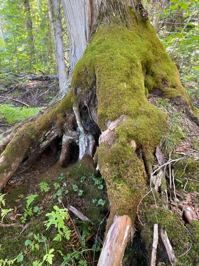 And just when I’m falling in love with this magnificent forest, it switched to a “younger” forest, with ferns, or blue asters and what seems like a blueberry trail. But in no time, old cedars appear again.