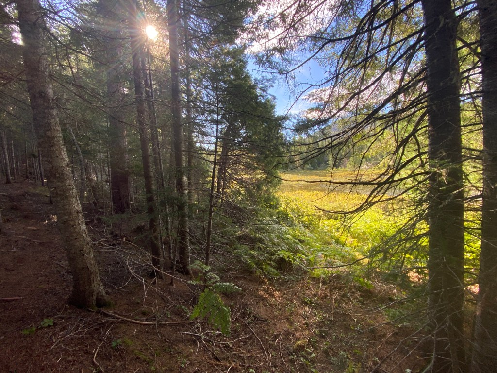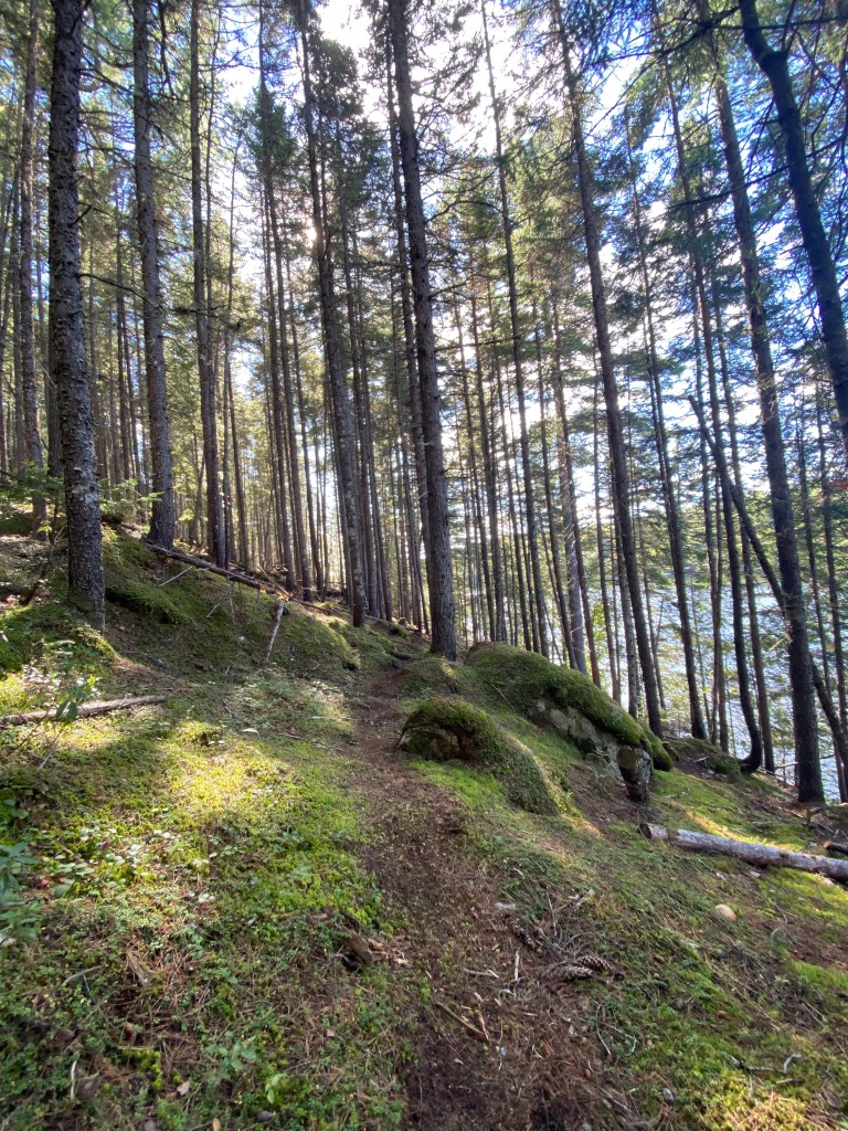 I’m really enjoying the trail up on the ridge before Indian Falls Depot. I don’t want to write about everything I’m seeing as it might take away the element of surprise if you decide to come up this way. But it’s such a joy when you’re hiking in the middle of nowhere and ‘poof’ , there it is, appearing before your eyes, a gorgeous lake. Up on a ridge, by the foot of Mount Denys- named after Nicolas Denys.