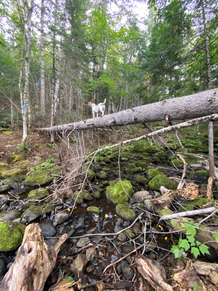 Macy won’t go just through the creek… no… Macy goes on every gymnastic obstacle she can find.