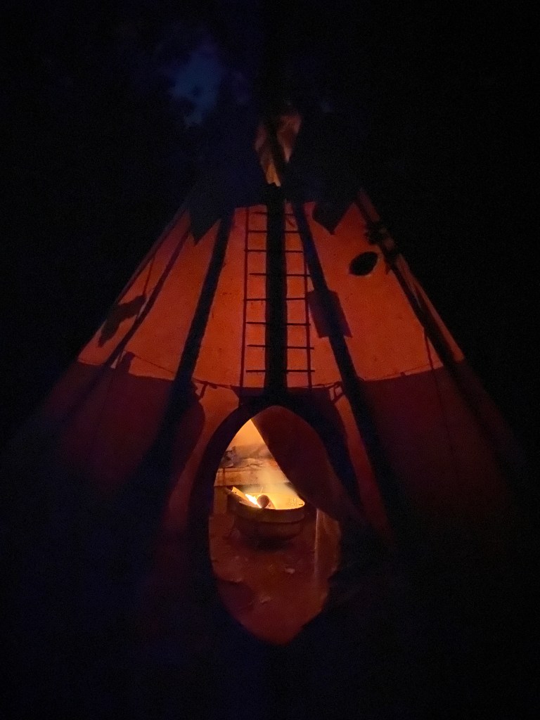 We knew by arriving late, we wouldn’t rush to leave in the morning. It sure is nice to have access to the teepee to gather our stuff and organize things.