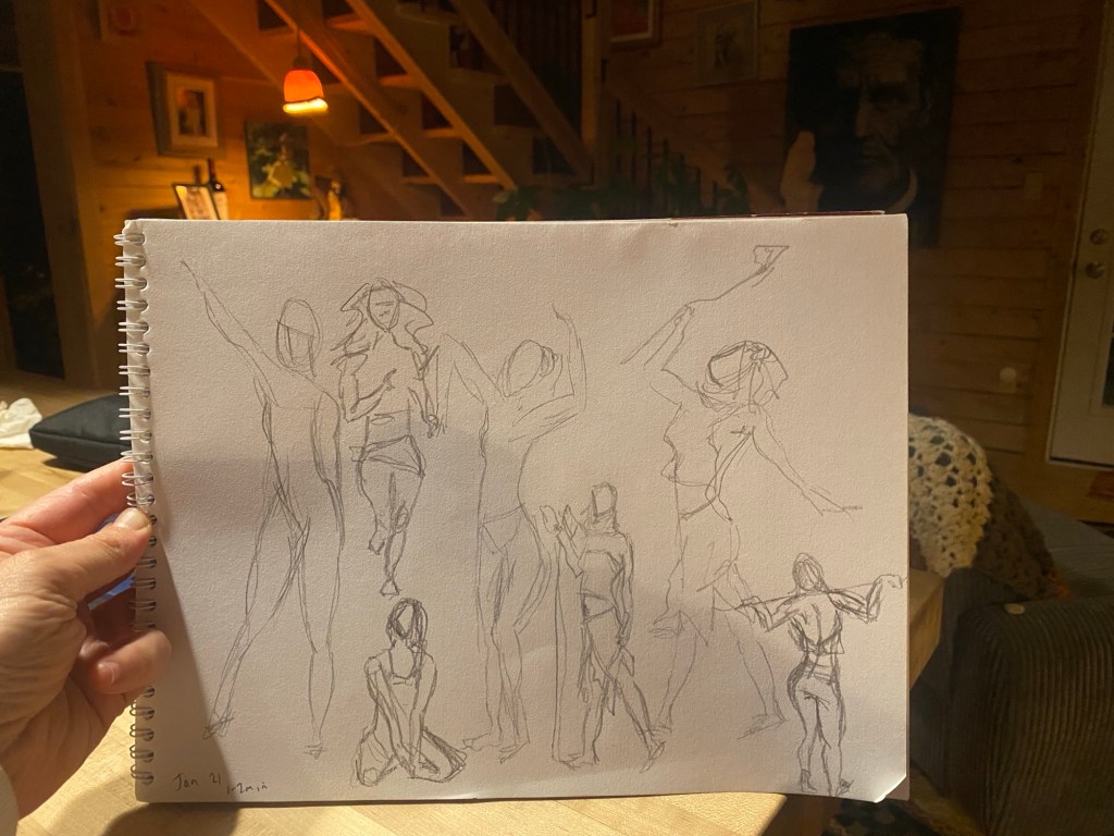 I don’t know if I’m getting any better at these quick gesture drawings- but I have been pretty good at showing up every day and scribbling a few in my sketch pad. I guess that’s what matters the most for now in these exercises.