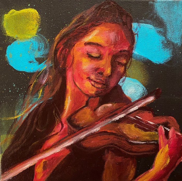 “Nuit majestueuse”, 8x8, acrylic Another one from my colors I mixed the other day. (I don’t want to waste all that paint!) Listen. Can you hear the music? 🎶